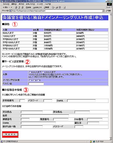 上記3項目の入力が終わりましたら画面左下にある 「申込する」のボタンを押して下さい。(これでお申込は完了です)